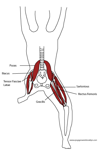 The hip flexor muscle group acts to flex the torso toward the thighs or lift the knees toward the torso. These muscles are constantly in action to support standing and walking and, as a result, can become very tight. Tight hip flexors are also associated with low back pain, since some of these muscles attach on the lower spine and pelvic brim. In yoga philosophy the hip region is associated with holding our most deep seated emotions, so tapping into this area is thought to release suppressed or hidden emotions, thoughts and energies. If you're looking to open and stretch this area, yoga poses like Warrior I pose, high lunge or goddess pose, can help to open this complex, large muscle group; start slow and work to deepen the stretch as appropriate for your body and comfort. You may find that regular stretching of your hip flexors helps to release tension in your low back, while freeing range of motion in your hips. shanti |