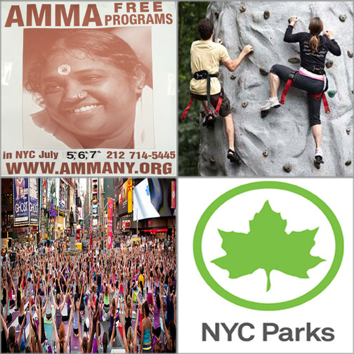 Amma- She is known to many as the "hugging saint" whose embrace is healing, however Amma does much more than that, through lecture and humanitarian work. She'll be in New York this July. Adventures NYC- The Parks Depart is in its tenth year of this program. June 21 and June 22, come out for free rock climbing, kayaking, biking, etc. Learn more about the event at their site. Solstice in the Square- This annual outdoor yoga event is a unique opportunity to practice yoga outside in the middle of Times Square. Learn more about it at their website. Outdoor Yoga- There are many opportunities to participate in outdoor yoga. Here is a listing of opportunities for outdoor yoga and other activities. Happy Solstice. |